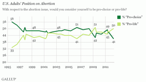 This not only illustrates a failure to have a sense of proportion when faced with heart wrenching stories of women suffering, but it also demonstrates that the central question about abortion is whether or not fetuses are human lives. That is the uncomfortable moral question that no one can get away from – and that the pro-life movement hates to face. And the reason it is so difficult to face, is because its answer is so obvious. So obvious in fact, that while Christians have lost the public argument about homosexual marriage, public opinion in favor of pro-life positions has grown (see pic above).